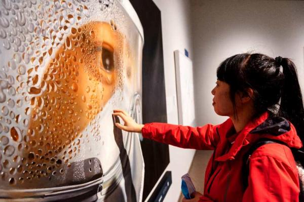 4月28日,画中人贵州援鄂的护士长龙艳在中华艺术宫抚摸作品《抗疫天使——2020年2月9日,武汉,晴》中的自己