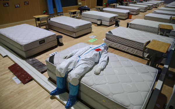 赖鑫琳,《如释重负》(3月9日晚,武昌方舱医院。湖北省人民医院江文洋医生在结束了自己在方舱的最后一个夜班后躺在空床上,如释重负)