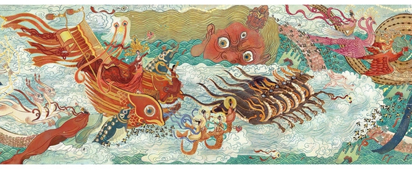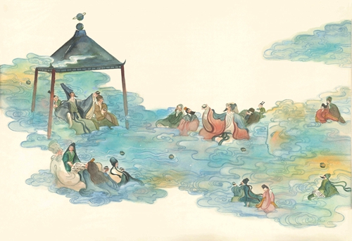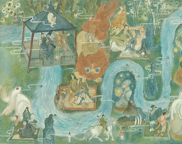 澎湃新闻:在书中“曲水流觞”场景的两个大拉页上,人物之间出现了很多动物和神兽的形象,有些画面占比还非常大,这个设计是有什么特别用意吗?