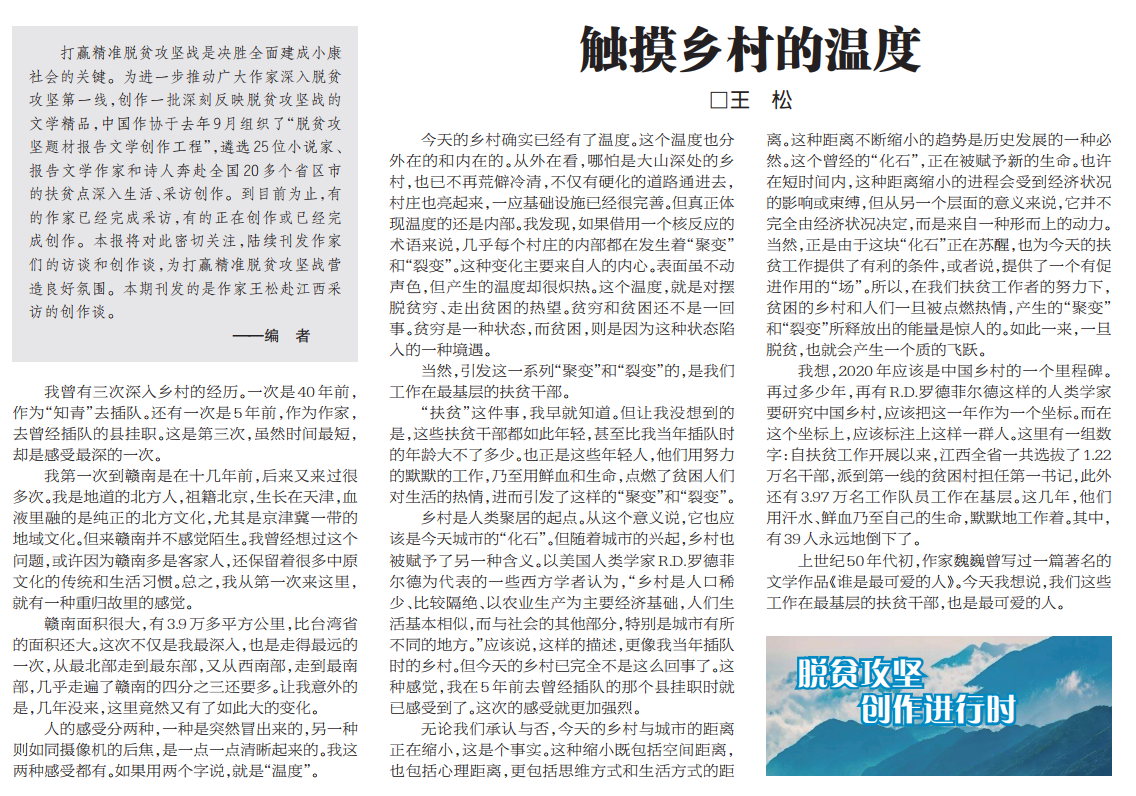 3月6日,《文艺报》头版刊发王松赴江西采访的创作谈《触摸乡村的温度》