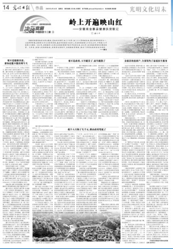 2020年4月24日,《光明日报》整版刊发潘小平作品《岭上开遍映山红——金寨县健康扶贫散记》