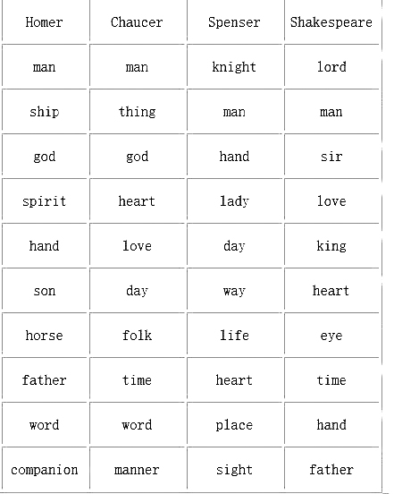通过这样的表格可以发现,荷马、乔叟、斯宾塞、莎士比亚的风格与他们所处时代的变迁得到了一种独特的呈现,通过主题词的变迁,电竞竞猜能够窥见不同时代的文学主题与不同作家的文本主题,达成对一位作家语言无意识的理解。就名词而言,在莎士比亚的所有文本中,爱是出场率第四高的名词,只有主(lord)、人(man)和先生(sir)三个词出场率高于爱,而其他三位作家所使用的最高频名词则没有爱(love),无论莎士比亚是伟大的爱情讴歌者,还是伟大的爱情质疑者,爱都是其一个重要表现和反思主题。
