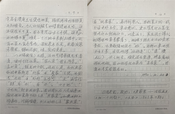 畅安老随即对答一文,名曰《答汪曾祺先生》,原载于《中国烹饪》1991年第四期,后收入自选集《锦灰堆》。文中,畅安老对汪先生提到的“骑自行车驮圆桌面”的传闻之误,“一捆葱做了一个菜,把所有菜都压了下去”的言过其实分别做了澄清,谦逊地表明自己“才疏学浅”,绝不敢厕身学人之林,随即自信地“随便说上几样”自己招待朋友做的七道“杂合菜”,可谓妙语连珠。不知此番对答是否加深了两位老饕的感情,多年后两人交往频繁,还共同成为范用、许以祺发起的“美食人家”的创会会员。此稿完成于1990年12月24日,畅安老写给孙孚凌的信日期为1991年2月12日,此稿尚未发表,故信札“连同尚未刊出拙作复印一并寄奉”。复印稿虽下原稿一等,但电竞竞猜毕竟看到了这篇多年后被人们广为转发、津津乐道,关注度绝对十万加的手稿原貌。