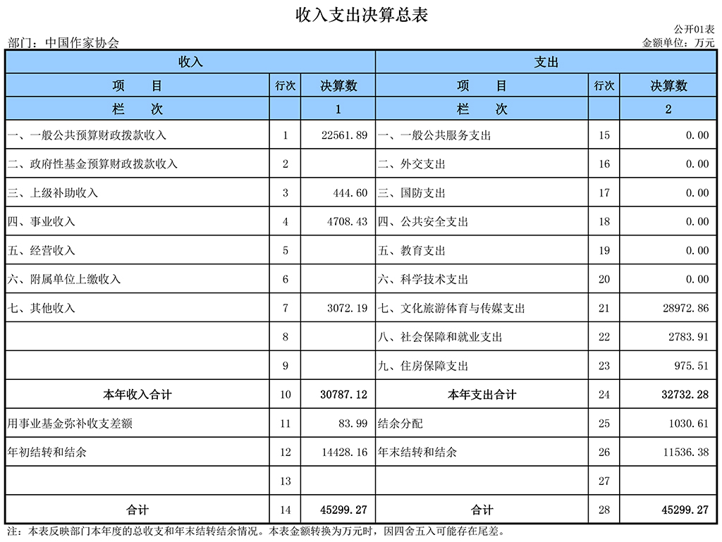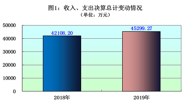 2019年度收、支总计45299.27万元。与2018年相比,收、支总计各增加3191.07万元,同比增长7.58%。