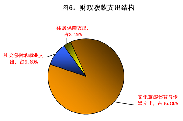2019年度财政拨款支出23853.08万元,主要用于以下方面:文化旅游体育与传媒(类)支出20717.81万元,占86.86%;社会保障和就业(类)支出2358.53万元,占9.89%;住房保障(类)支出776.74万元,占3.26%。