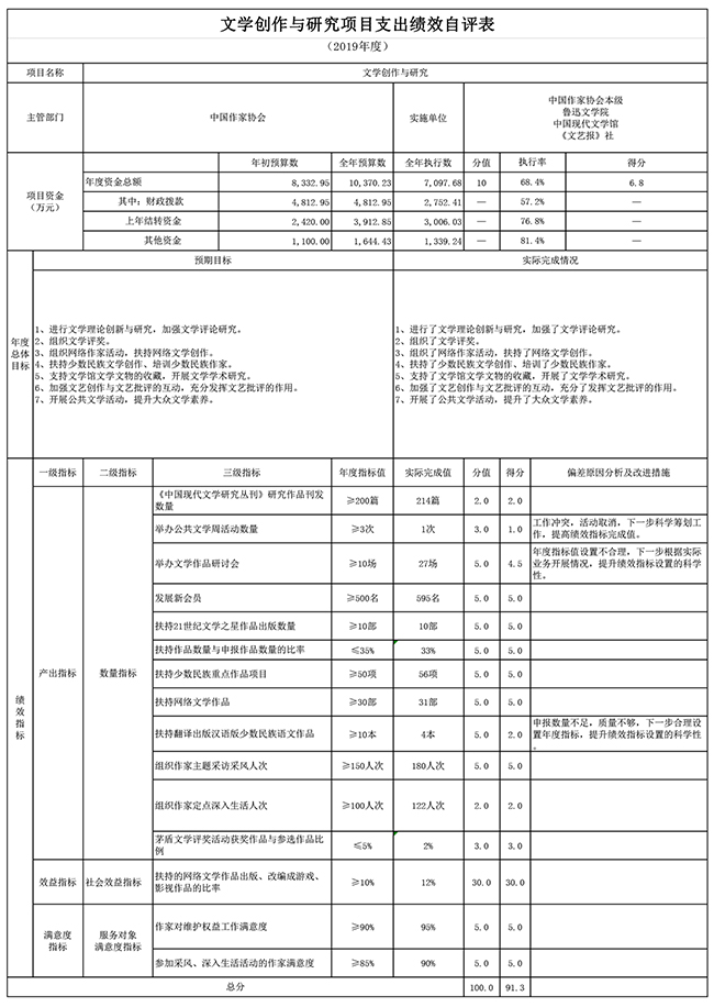 1.“文学创作与研究项目”绩效自评综述:根据年初设定的绩效目标,项目自评得分为91.3分。项目全年预算数10370.23万元,执行数为7097.67万元,完成预算的68.4%。项目绩效目标完成情况:组织多批作家深入生活,举办公共文学活动,茅盾文学奖评奖,文学作品扶持;扶持了少数民族文学和网络文学创作;支持了文学馆文学文物的收藏;开展了文学学术研究,加强了文艺创作与文艺批评互动,充分发挥了文艺批评的作用;进行了文学理论创新与研究,加强了文学评论研究。发现的问题及原因:一是年初设置的个别指标不合理;二是部分二级项目执行进度较慢。下一步改进措施:增强指标设置的科学性,加快预算执行进度,提升文学工作的开拓性与创新性。
