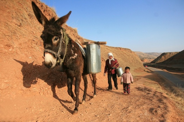 因为极度缺水,西海固人曾经习惯了驴驮水(季正 摄)