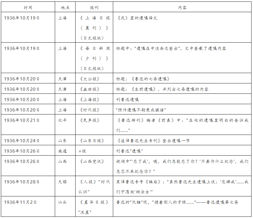 报道鲁迅逝世消息附登“鲁迅遗嘱”的新闻统计表