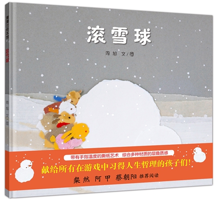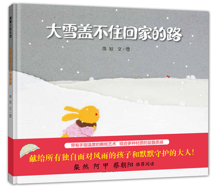 《滚雪球》《大雪盖不住回家的路》《躺在草地上看云朵》这一系列的画面处理上,我放弃了传统的绘画手法,首次尝试用撕纸粘贴的形式。手工纸和手工宣纸的薄厚,粗糙的纹理,层层叠加后所产生的深浅变化,使画面的色彩和层次变得更加微妙,更加丰富也更加韵味独特了。我想一本绘本应该像人一样有自己的气质和性格,我想把这个系列做成比较文静的图画书,这种尝试也是想让这几本书的气质和性格和别的绘本能够有所不同。