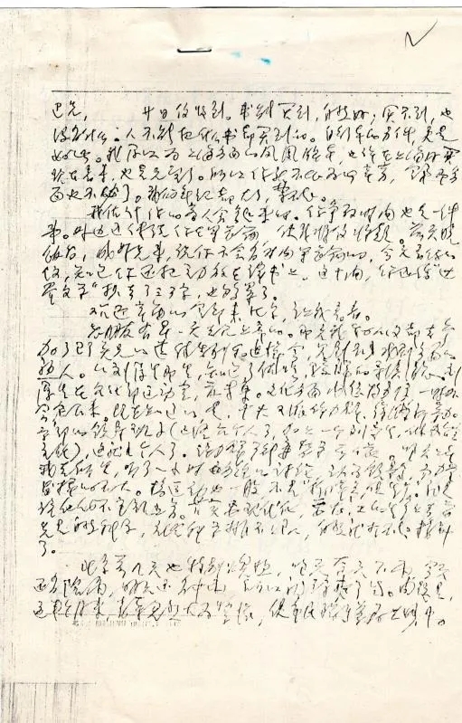 此信为残简,无落款信息,《巴金全集》判定其写信日期为“一九七七年(约)三月 日”。从书信内容来看,其时应在打倒“四人帮”后不久,1977年3月大致符合这个时间背景。然而仔细阅读,发现信中还有其他信息可供推敲。巴金在信中说:“你的文章还在我这里,我打算过两天就给你寄去,只是我看见你寄给辛笛的信封上写的地址和以前写给我的不同,大概是胡同改了名吧,究竟写什么好,请你告诉我。”李健吾1976年12月15日致巴金信中说:“十二日信,昨夕到达。首先,我的地址是‘北京东城东罗圈胡同11号4201室’。东罗圈胡同,在文革时期改为‘远见胡同’,它在干面胡同(在文革时期,也改为瑞宝路16条)内东头,现在这两个胡同都又改回原来的名称。所以可能你发现有些出入。你就把我那几篇怕见公婆的东西寄到上述地址吧。”[v]这极有可能是对巴金来信的复信,可初步判定这封残简的写信日期为1976年12月12日。