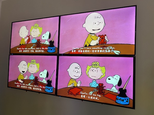 孙文倩表示,《花生漫画》的成功在于它不仅是针对儿童读者的产物,其创作背景正值“二战”结束,美国社会飞速发展,国际社会关系两极对立的“冷战”时期。漫画中体现出的对社会的洞察和反讽令人心生共鸣。在展览中,邬建安的作品《我是第一只登月的比格犬》便与时代背景相关,在现实中,史努比的确登上过阿波罗10号宇宙飞船,而漫画中也曾讲述史努比登月的故事。在这件作品中,艺术家以装置还原了漫画场景:身处“登月舱”的史努比上方,几行彩色的字幕写道,“我是第一只登月的比格犬。我打败了俄罗斯人。”漫画以此映射了当时的国际关系,而在今天,艺术家的重新演绎却仍然应景。而在这件作品所在房间的外侧,四块屏幕重现了动画片中有关露西的场景。孙文倩指出,《花生漫画》的作者查尔斯·舒尔茨在他的时代是前卫的,“因为早在20世纪60年代,他就塑造了一些具有女性主义痕迹的角色;此外,他在1968年时就将一个黑人小孩的角色引入漫画。”值得一提的是,这个角色的创造的确不是出于偶然:1968年,黑人运动领袖马丁·路德·金遇刺身亡,不久后,一位女教师写信给舒尔茨,呼吁通过漫画的力量来唤起社会的平等。这个名为富兰克林的儿童角色便是舒尔茨的回应。