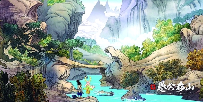 区别于目前动画市场上流行的三维大制作,《新愚公移山》选择了二维手绘风格。这一形式的选用除了基于成本把控外,更出于对作品形式与传统文化气韵“适配性”的考量。片中作画感十足的山水背景,承载着宋画《千里江山图》的风格与意境,让观众眼前一亮。此外,影片在配乐中也大量运用了传统戏曲元素。中国风浓郁的视听效果,配上当代性的创新解读,让作品洋溢着浓浓的“国潮”质感。