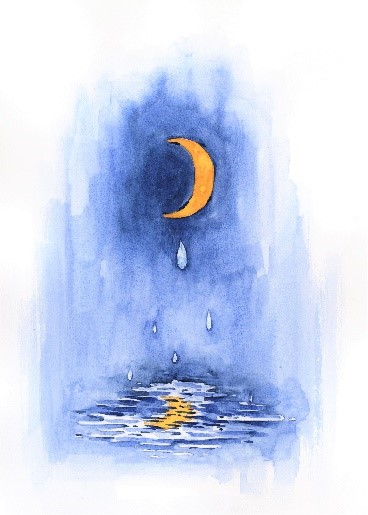 没有交流的创作是没有灵魂的。编辑、作者和我建立了一个交流群组,它有一个好听的名字——自然邮递员。我每创作一幅插图之前都会画草图供大家讨论。这个步骤对一个新手很重要。比如“月亮”这一篇,“你要是渴了,就坐在屋顶,顺便端上一个小碗。月亮水汪汪的,一定能滴下水来。”第一版草图,我画端着碗的小猪坐在房顶上发呆,碗中映着月亮的倒影。编辑们给我的建议是——描绘“月亮滴水”的场景,能表现出“看上去像假的,其实是真的”的哲思,同时又富有意境。相比之下,之前的表现方式未免过于真实,少了些意境和美感。是的,这本书除了具象的“超级田野”,还是抽象的、哲学的。通过讨论、修改“月亮”的画稿,绘制的风格和方向突然明朗了。