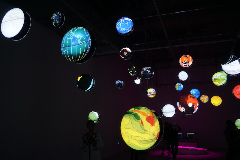 本次展览同名作品《世界处理器》严格意义上只是灯箱,但是却是数据的艺术,也是基于数据的艺术,在散落在展厅中的平面化的地球仪上描绘的是与人类命运和历史相关的重要的数据:有的是难民的移民路线,是难民共和国的地图;有的描绘的是因为国家的、地缘的、政治性的关系,时区的线会改变的现场……艺术家Ingo Günthe是一个对社会问题非常敏感的艺术家,他将数字世界展开在地球仪形状的界面上,架空于此时此刻,是关于人类文明命运的想象。目前有400多个这样的主题,制作了1000多个地球仪,其中一些被摧毁。在艺术家看来,“每个星球都需要发明一种新的代码来恰当有效地表示数据……我受到了世界整体不可理解性的挑战。”