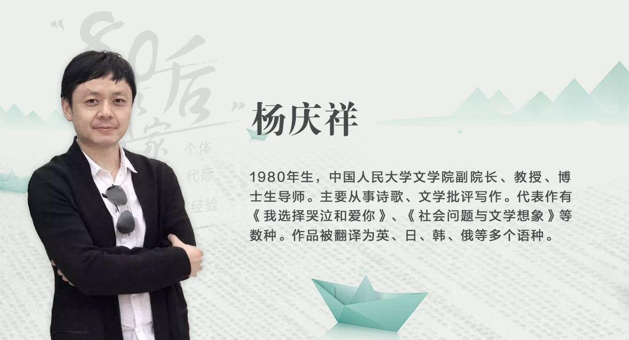 杨庆祥:我是在博士阶段对自己作为代际的一份子有了比较强烈的自觉,就是说有了“我作为一个出生在1980年代的生命个体和历史存在”的清醒意识。个人与历史和社会之间到底构成什么样的关系,亦或个体和集团、个人和历史、个人和社会之间到底构成一种什么样的关系,是我一直以来所有思考、写作和研究的一个基本出发点。