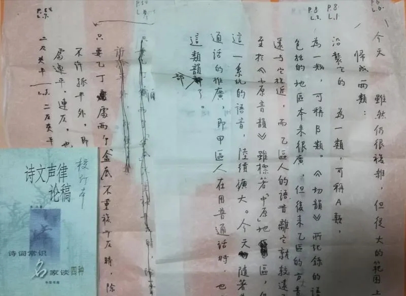 如前所述,先生晚年因视力衰减已不便用毛笔书写,但他为了便于手写本《诗文声律论稿》的修订,硬是用硬笔在若干绵纸上书写了修补内容,并一一注明补放在何处。当他把这一叠耗费了极大心血的绵纸交给我时,我真是满含热泪,感动不已。