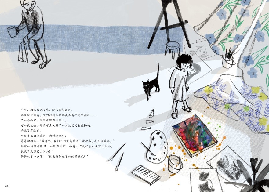 回顾一下前11页中雨露的状态,她从一个喜欢乱写乱画的天真小孩,到跟着爸爸和老师学画,以及第一次面对画布时的犹豫不决。现在的雨露成了一个独立的个体——画家,有了和父母相左的意见,她变得“执拗”,变得勇敢,变得“不管不顾”。用爸爸在第27页的话说就是“她就是这么一个死心眼的女孩儿!”这句话是爸爸对着画布说的,千万不要觉得这是一句贬损的话,因为爸爸的下一句是“你遇上她,算是你一生的幸运!”是啊,在爸爸的心中,女儿拥有超人的绘画才能,可这样的才能居然不被画布接纳,他心疼女儿,她要为女儿抱不平。
