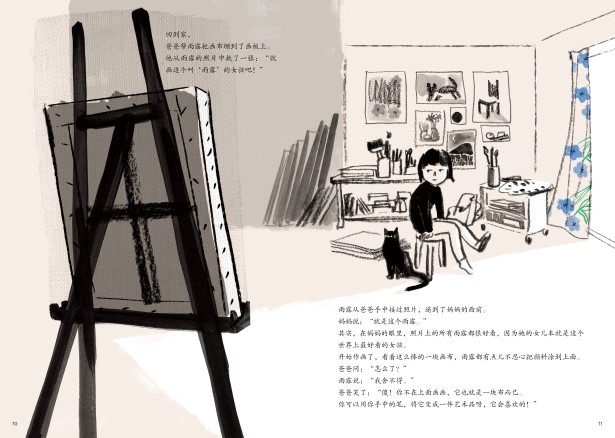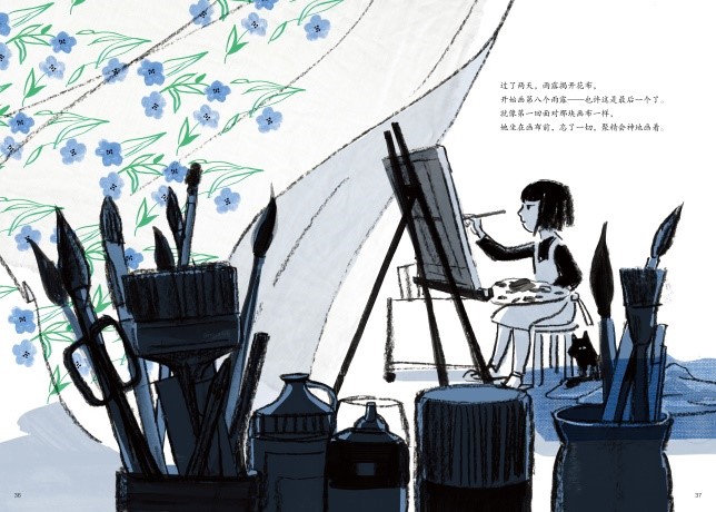 苏西·李的构图一向让人惊叹,这次她不仅展现了精巧而丰富的构图,她还为炭笔的粗犷笔触居然铺上清爽的淡色,加上布料的真实纹理与代表性的小碎花图案,从根本上改变了文字的厚重感,图画书读起来非常的清新和文艺。大面积和主框架的黑色并不会给人压抑的感觉,反而非常切合画画这个题材的气质。