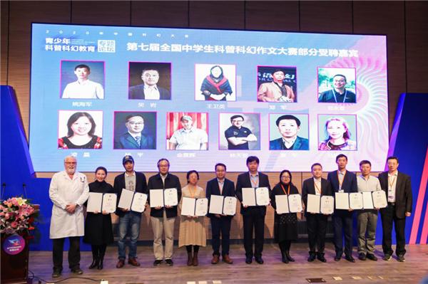 英籍科学家戴伟(左一)和中国科普作家协会理事长周忠和院士(右一)为第七届全国中学生科普科幻作文大赛部分专家授奖