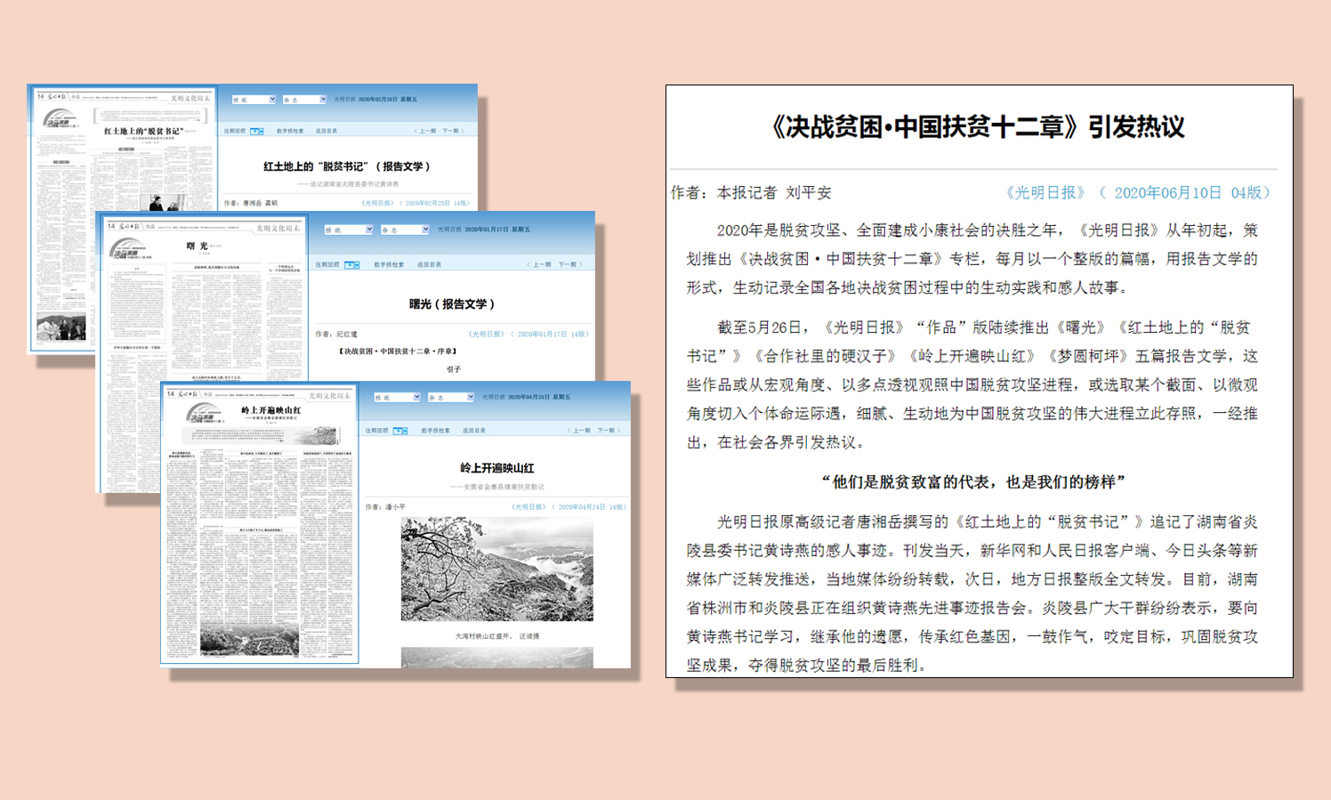 进入2020年后,“脱贫攻坚题材报告文学创作工程”作品收获不断,从报刊杂志到互联网站,这些生动感人的鲜活故事由作家笔下走进人民心中。《光明日报》从年初起,策划推出《决战贫困?中国扶贫十二章》专栏,每月以一个整版的篇幅,用报告文学的形式,生动记录全国各地决战贫困过程中的生动实践和感人故事。《曙光》《红土地上的“脱贫书记”》《合作社里的硬汉子》《岭上开遍映山红》《梦圆柯坪》等报告文学,或从宏观角度、以多点透视观照中国脱贫攻坚进程,或选取某个截面、以微观角度切入个体命运际遇,细腻、生动地为中国脱贫攻坚的伟大进程立此存照,一经推出,在社会各界引发热议。《光明日报》文化部副主任邓凯在接受电竞竞猜官网记者采访时说,“经过一个社会变动布局急剧变化之后,文学总是在慢慢的向它的本质靠近、回归,文学应该给电竞竞猜读者给电竞竞猜的人民以笃定的力量,困境的时候要给他们信心,在伤痛的时候要抚慰他们,在前进的时候给予他们力量。”