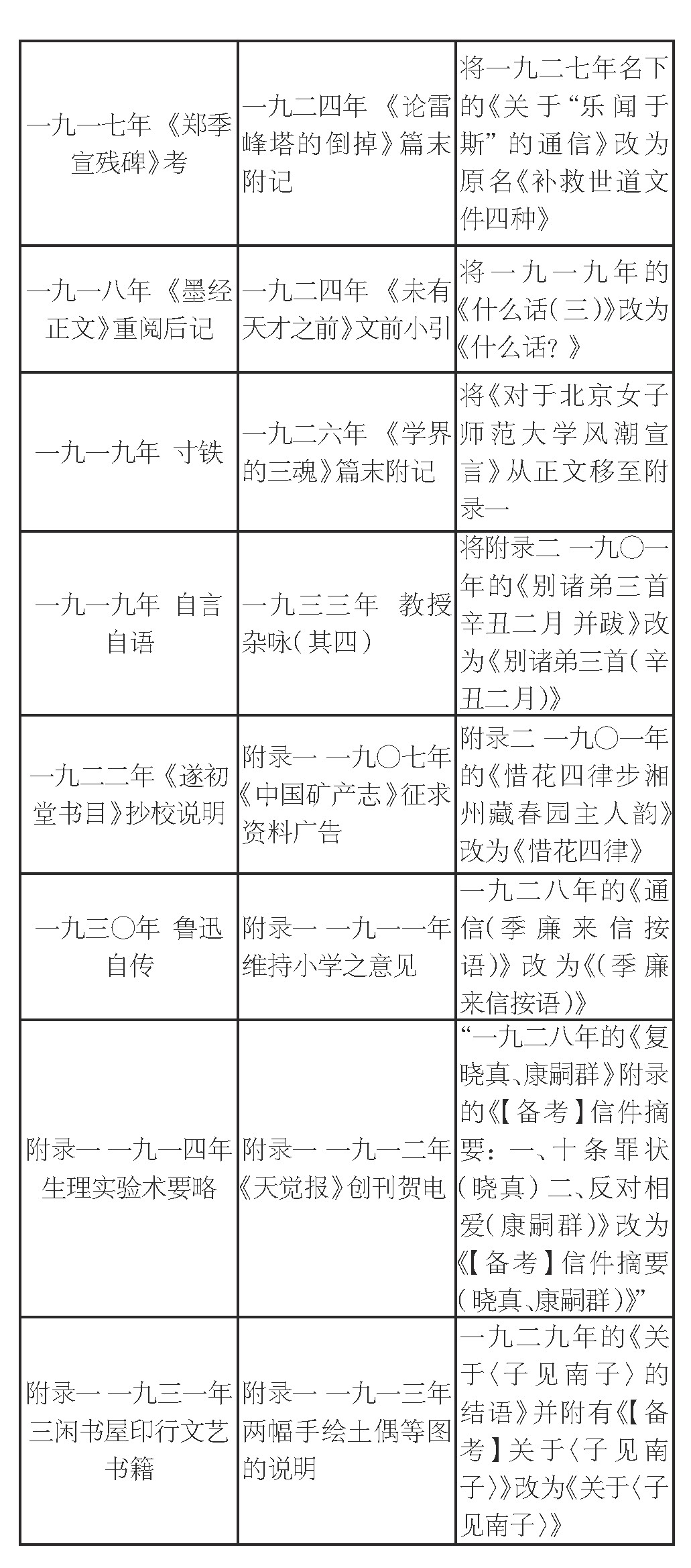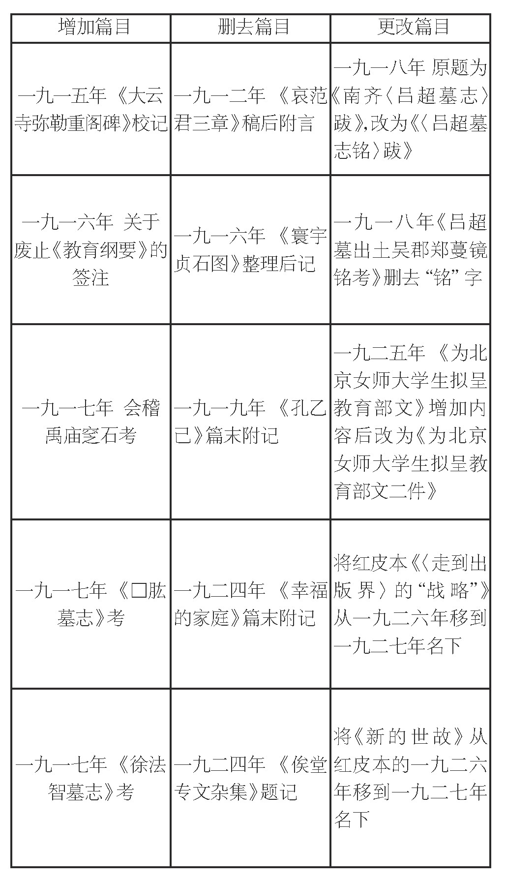 《集外集拾遗补编》篇目的变动分为三种情况——增、删、改,数量依次递增:增加篇目14篇,删除篇目23篇,更改篇目42篇。更改篇目又可细分为更改标题、调整顺序、调整篇目位置。更改标题25篇,如《南齐〈吕超墓志〉跋》改为《〈吕超墓志铭〉跋》,这是编注者代拟标题的情况。另一种则是恢复原有的标题。如将一九二七年的《关于“乐闻于斯”的通信》改为原名《补救世道文件四种》。调整顺序6篇,根据发表时间重新排列篇目顺序,如将《〈走到出版界〉的“战略”》《新的世故》从一九二六年移到一九二七年名下。