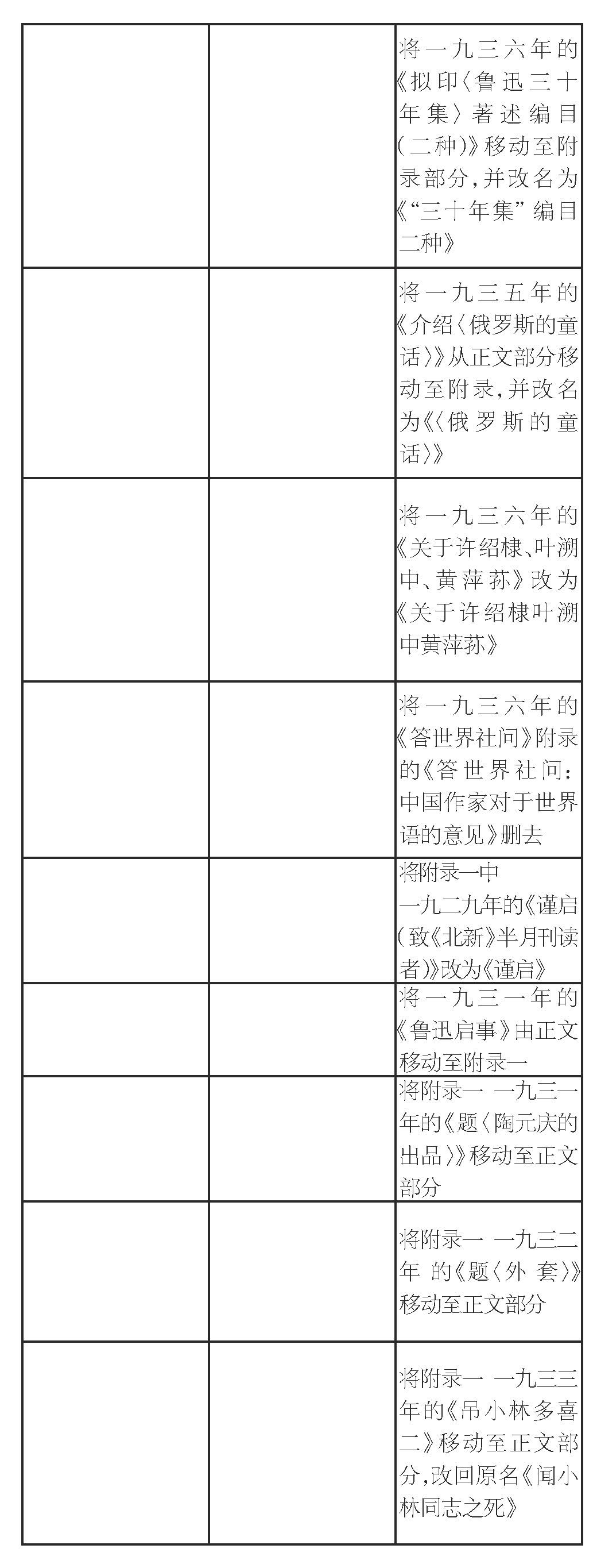 调整篇目位置14篇(其中3篇同时改名),指将文章在正文与附录一之间对调,数量虽少,却颇具讨论空间。其中从正文转为附录一的4篇,从附录一转为正文的10篇。结合篇名与文章内容,大致可以判断对调的原因。由正文转为附录一的多是应用文体,包括宣言、编目、广告、启事等。附录转为正文则更强调文学性,需要“相对成文”。10篇中有7篇都是题记,尽管短小,却很隽永,自成一体。如《题〈陶元庆的出品〉》睹物思人,寄托哀思怀念,感情真挚强烈。《题〈淞隐漫录〉》等四篇介绍古籍版本源流、考订异同,已形同书话。其他三篇,《闻小林同志之死》近似于悼念词和声明的复合体。《〈远方〉按语》《〈中国杰作小说〉小引》两篇则实际是序跋。