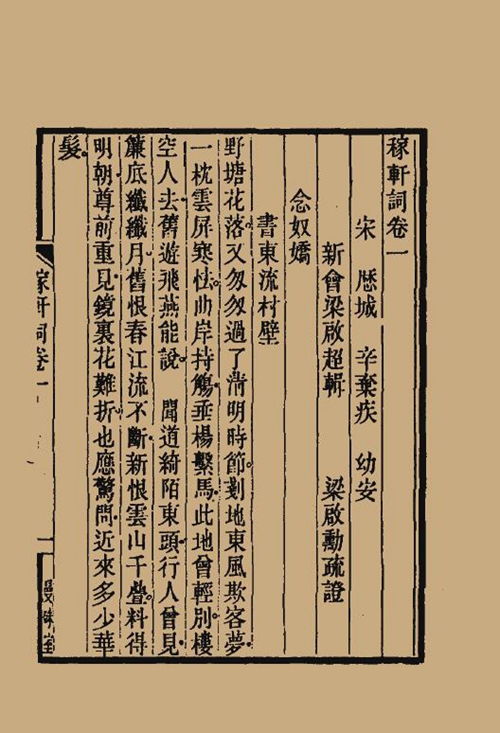 《稼轩词疏证》一书就是在这一思想指导下,运用现代文献学方法研究稼轩词的结晶。梁氏兄弟对于辛弃疾的英雄事迹和《稼轩词》的英雄气概都极为推崇,称得上一种“稼轩情节”。为了“提出整个之辛弃疾,以公诸世”,先是梁启超编纂《辛稼轩先生年谱》,惜未竟而卒,随后梁启勋编《稼轩词疏证》,“继伯兄未竟之业”(《稼轩词疏证序例》),还在卷首撰写《稼轩先生之特殊性格》一文,“列举客观之事实”,“表现先生之全人格”(同前)。他以信州本为底本,参以吴讷《百名家词》本等版本,共辑得辛词623首,在当时已允称赅备。全书分为六卷,以年为序,卷一、二为淳熙丁未以前词,卷三为戊己庚辛四年词,卷四、五为壬子至辛酉之十年间词,卷六则为壬戌以后四卷本所未收之词,每卷先标出年岁及所在地,每首之下先录梁启超校勘与考证语,次录梁启勋案语。虽然梁启勋自谦不敢称编年,但其结构体例已开创了词集编年笺释之法。是书在辛弃疾生平考辨上也有很多创获,如《沁园春·带湖新居将成》,据洪景卢《稼轩记》和辛敬甫《稼轩年谱》,证新居落成于淳熙十二年,移帅隆兴府也在十二年。林志钧认为是书“大之足以补史传、方志所不备,次之则稼轩生平志业、遭际出处踪迹,俱略可悉”(林志钧《稼轩词疏证序》)。要之,《稼轩词疏证》是梁氏昆仲辛弃疾研究的结晶,是现代词学文献学的重要收获,也是梁启勋以意境和情感为核心的词艺观和批评观的集成式成果。