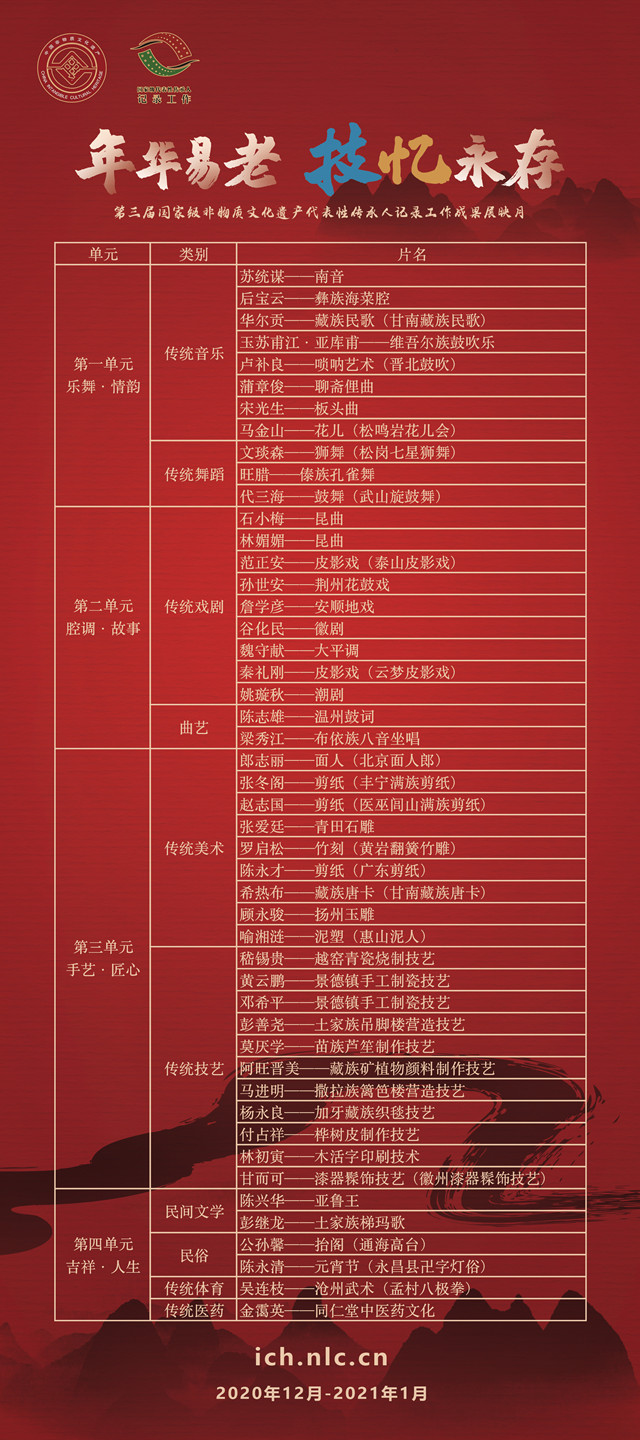 12月31日,随着48部非遗纪录片在国家图书馆中国记忆项目中心的非遗展映专区(ich.nlc.cn)上线,第三届“年华易老,技?忆永存——国家级非物质文化遗产代表性传承人记录工作成果展映月”正式拉开帷幕。