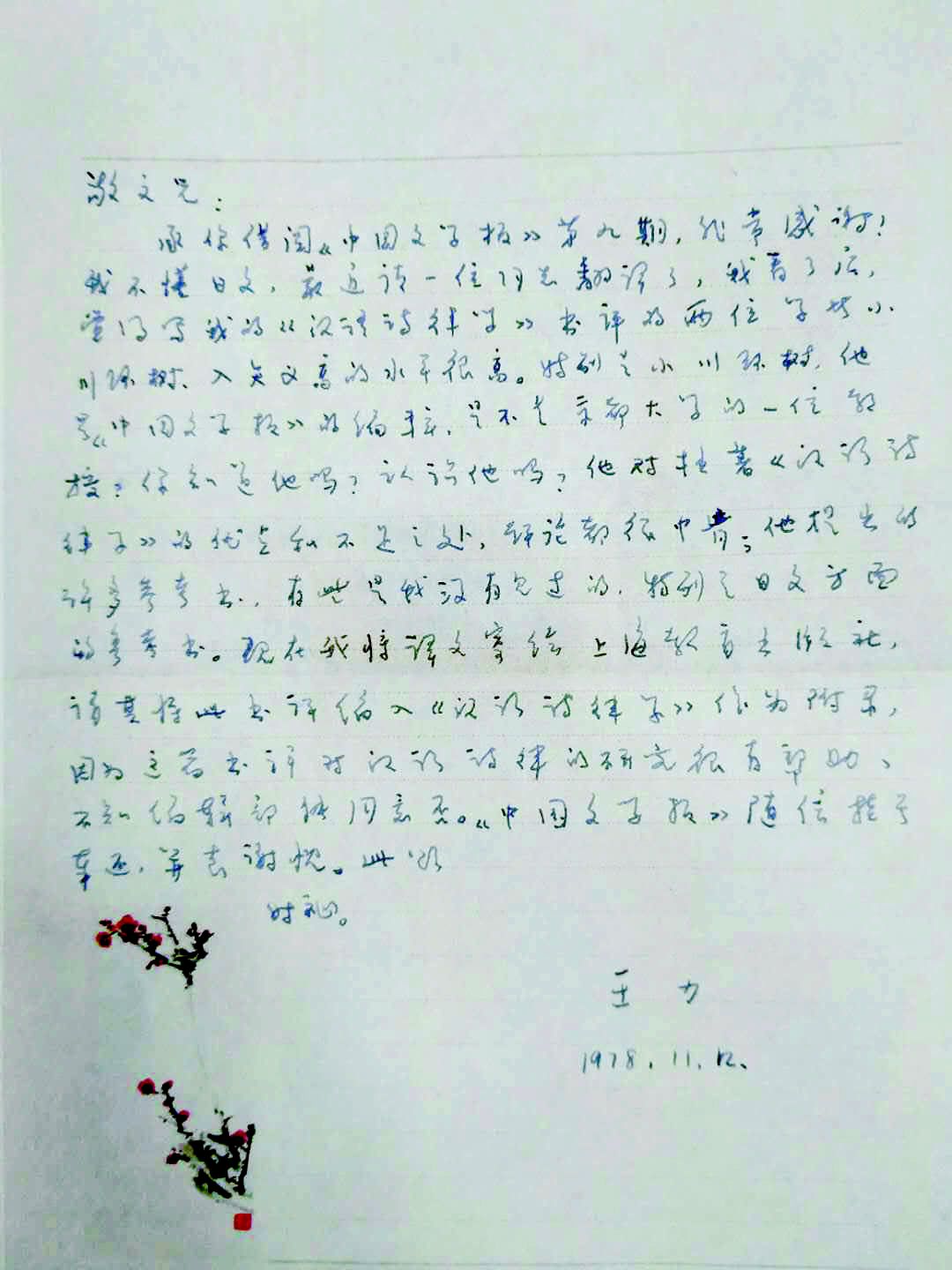 从此信内容来看,1978年,钟敬文在得知王力准备再版《汉语诗律学》之后,向其寄送《中国文学报》第9期。《中国文学报》创刊于1954年,由日本京都大学文学部中国语学中国文学研究室主编。王力的《汉语诗律学》在1958年出版后,就引起日本汉学家小川环树、入矢义高的关注,当年即在《中国文学报》发表书评。由于多种原因,直到1978年,王力才通过钟敬文的推荐看到这篇书评,他对文中的观点表示支持,认为很有价值,并建议上海教育出版社把此文收入《汉语诗律学》修订版。不过,从1978年2月王力写好《汉语诗律学》的《重版序言》可推断,可能当时上海教育出版社已经开始排版工作,故这一建议未实现,未加入这篇书评。