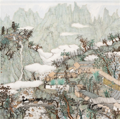 “美丽的事业·中国国家画院扶贫主题美术作品展”上展出的何加林中国画《老寨新韵》。