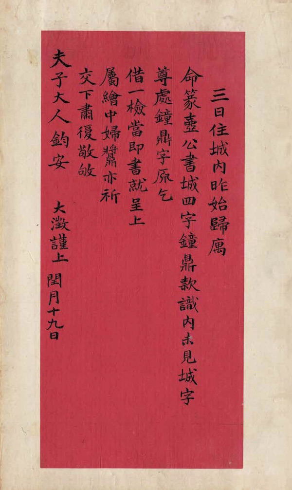 三日住城内,昨始归寓, 命篆“壶公书城”四字,钟鼎款识内未见城字, 尊处《钟鼎字原》乞借一检,当即书就呈上。属绘中妇?亦祈交下。肃复,敬敂 夫子大人钧安。大澂谨上。闰月十九日