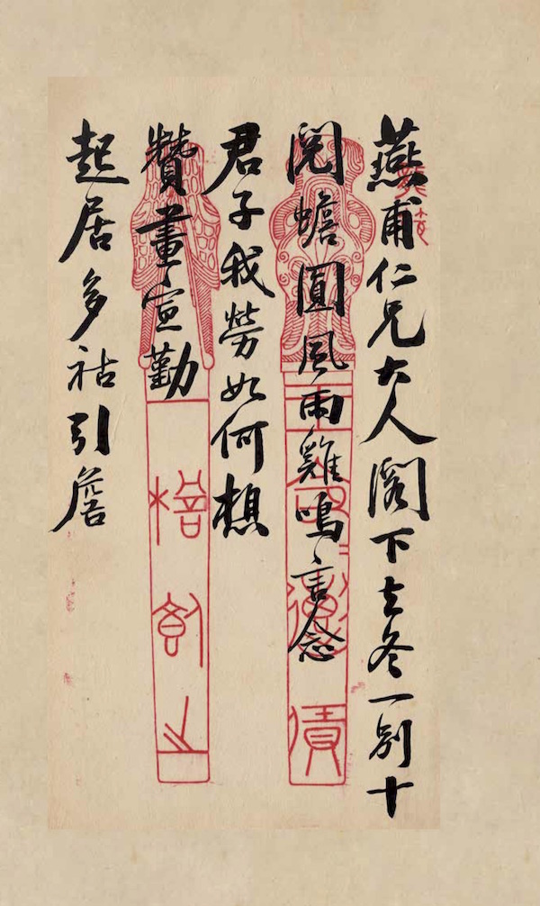 燕甫仁兄大人阁下:去冬一别十阅蟾圆,风雨鸡鸣,言念君子,我劳如何,想赞画宣勤, 起居多祜,引詹