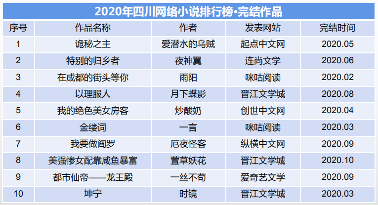 根据《2020年度四川省网络小说排行榜评审工作方案》,经初评、终评程序,评选出2020年已完结网络小说《诡秘之主》(爱潜水的乌贼)、未完结网络小说《元尊》(天蚕土豆)等20部作品。现将名单公示如下。