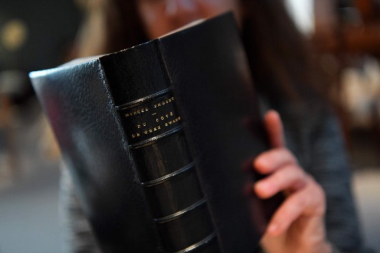 当地时间2017年10月30日,法国巴黎,一名参加拍卖会的妇女拿着《追寻逝去的时光》第一部的复制品。 视觉中国 资料图