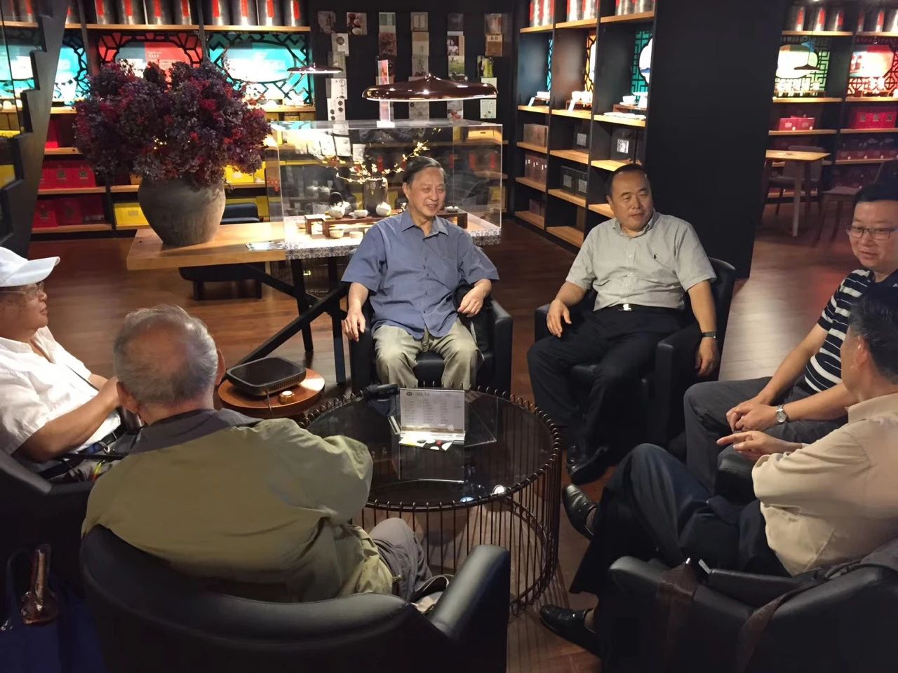 董仁威(左一)与王晓达(中)、吴显奎(右三)在2017年《追梦人——四川科幻口述史》新书发布会上,姚海军供图