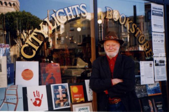 1953年,费林盖蒂在旧金山North Beach附近散步时,看到一名学生在一家店面张贴了一块招牌。Ferlinghetti问他在做什么,这个叫Peter Martin的年轻人说他正在开一家书店,但没有足够的钱独自去做。两人当场商定,每人出资500美元,共同拥有这家店,于是”城市之光”书店在1953年6月诞生了,其标志性的三角形店面迄今仍在经营。第二年,马丁搬到了纽约,费林盖蒂成为了这家店唯一的所有者。“垮掉的一代”核心成员们在城市之光门口,摄于1956年。从左至右:鲍勃·唐林,尼尔·卡萨蒂,艾伦·金斯堡,罗伯特·拉文奇,劳伦斯·金斯堡。
