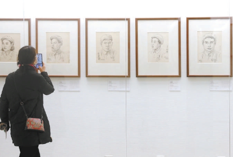 一幅幅英模人物的素描肖像引得观众驻足观看。本报记者 饶强摄