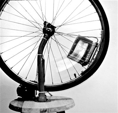 对艺术史中名作的致敬反思还包括日本艺术家久保田成子向杜尚致敬之作《杜尚式:自行车轮(一)》。这件作品在静止的自行车轮上引入机械化运动,并在辐条上固定了一个非常小的监视屏,在自行车轮的转动中,监视屏跟着旋转,如果你定睛观看,则会发现它一会儿是清晰的风景,一会儿是模糊的单色画面,引发的错觉类似于冥想体验。