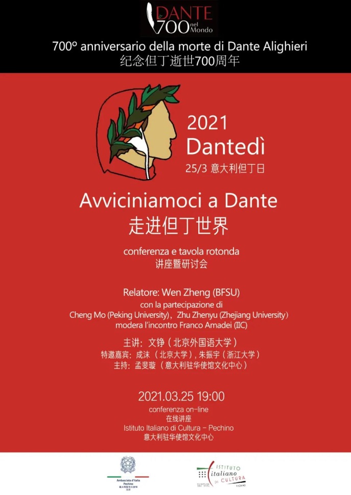 2021年是意大利诗人但丁逝世700周年,世界各地正以丰富多样的形式纪念这位中世纪最伟大的诗人和欧洲人文主义的先驱。一年前,意大利文化遗产与活动部将每年3月25日命名为“但丁日”(Dantedì),号召意大利乃至全世界各国人民铭记这位人类世界伟大的诗人和思想家,诵读其作品,传承其思想,彰显其精神。