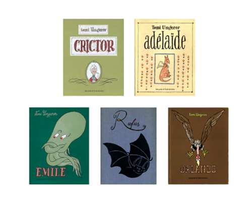 其次,温格尔童书的主角大多是之前从未在童书上出现过的,与可爱无关、甚至让人们反感的动物——蟒蛇克里克塔(Crictor),章鱼多多(Emile),袋鼠阿朵莱朵(Adelaide),蝙蝠鲁弗斯(Rufus),秃鹫奥兰多(Orlando)……