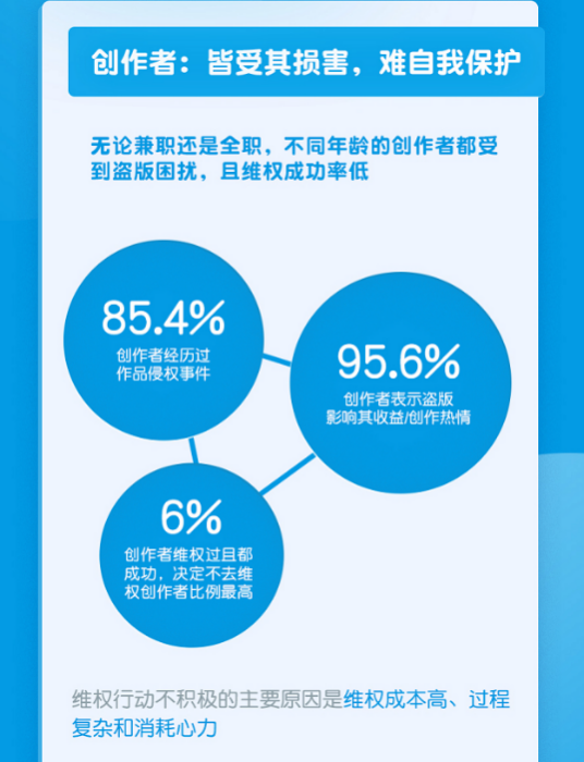 阅文集团白金作家、热播剧《锦心似玉》原著作者吱吱表示,调查显示,在遭遇过侵权的创作者中,仅32.1%的创作者有过维权行动。维权行动不积极的主要原因是维权成本高、过程复杂和消耗心力。