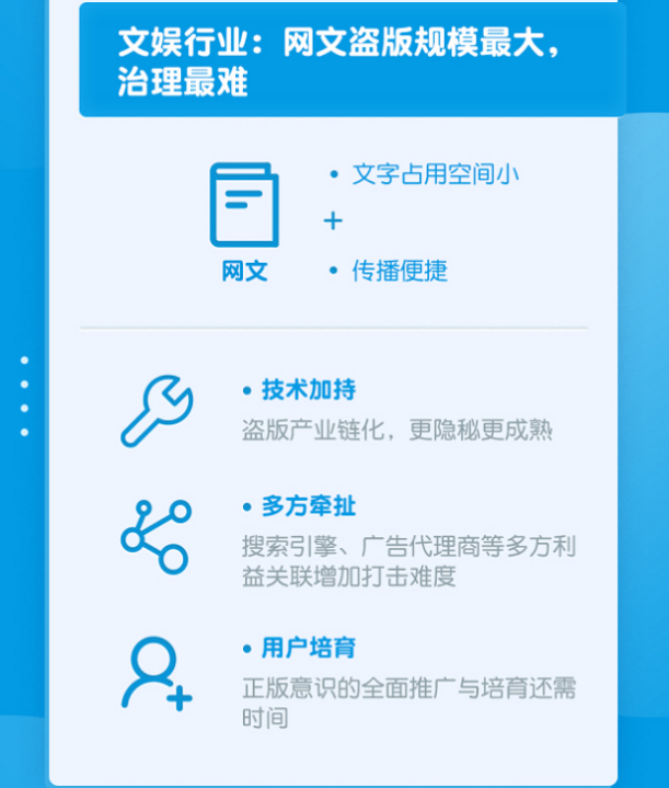 白皮书同时指出,横向对比视频、音乐、游戏等数字内容产业,网络文学的版权保护难度更大、形势更严峻:一是新技术让盗版产业链隐蔽化、成熟化趋势越发显著;二是盗版平台积累了大量流量,商业变现依赖搜索引擎、广告代理商等利益相关方,多方利益输送增加了打击难度;三是正版意识在用户市场的全面推广与培育还需要时间。