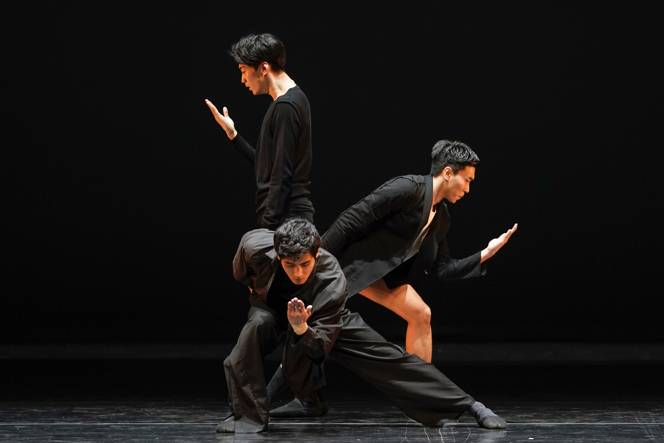 演出的最后是编导李旸的作品《山河》,他将舞台化作天地,以舞者肢体描绘祖国壮美山河,寓意一代代中国人民汇人成山、聚人成河不断努力的奋斗历程,寄托了山河永固的美好祝愿,表达对祖国的深厚情感。