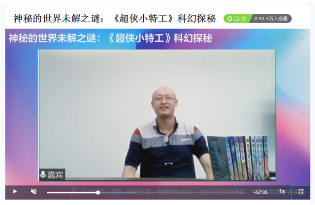 5月8日晚7点,科幻作家超侠在线上为读者和青年科幻作家带来“神秘的世界未解之谜:《超侠小特工》科幻探秘”直播讲座。本次活动由中国科学技术出版社有限公司主办,中国科普作家协会科幻创作研究基地承办,科创中国、科技工作者之家、科普中国提供支持。活动在科技工作者之家、科普中国、微博、抖音、新华网、知乎、哔哩哔哩等多个平台同步直播,线上观看人次超过50万。