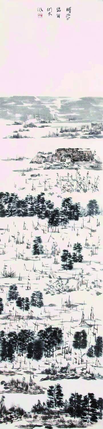 在专注局部、做足画面层次的减法之后,在“雪”的运用为山体皴擦做了减法之后,李明久开始做“加法”,他或叠加雪中的树,或叠加雪中的高杆植物等,和以往中国山水画法中的树木叠加不同,李明久的这一叠加有着强烈的个人诉求:他有意让自己的叠加“疏朗地布满”,让叠加布局于整个画面,而不是以往绘画中的团簇方式,形成疏密对比;他的叠加同样有轻重疏密和远近关系,但李明久充分利用着“近景”并和近景匹配,他的轻重、疏密、远近都是适度而精心的,一边弱化对比性一边又从结构关系中调整出来;他的叠加时有“重色”,这种重色与雪的留白既构成对比同时又将雪的留白有效地化为实体,成为承担这种重色所带来的“重量感”的独特部分。在这里,在言说李明久所做的独特创造的同时我必须要再次强调对艺术规范性的尊重和反复掂量的艺术精心:无疑,李明久的“雪域山水”极为独特,个人标识强烈、“独创性”明显,然而它的每处变幻,每种个人的突破都是反复掂量、反复试错和调整之后的结果,始终保持着意外中的合理,保持着对于艺术规范的熟谙和平衡把握。“每当我打开明久的画集,或者看到他发表在一些杂志上的画作时,便感到一种耳目一新的喜悦;而且这种喜悦会经久不衰。这就是说他的画作不仅使我耳目一新,而且也使我耳目常新、百读不厌。能够做到耳目一新固属不易,能够做到使人耳目常新则更是难事。对一个画家来说更重要的则是后者。”画家孙其峰曾如此评价。耳目常新,耐看耐寻味,必须是突破了某些旧有困囿的同时又暗合审美法度,有一种内在的艺术平衡。