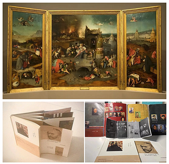 上图:博斯三联画;下图:《观看的技艺》。三联画源于欧洲宗教祭坛画,后来被文艺复兴时期的画家们采用,以三块表现某内容的绘画横排展示为一组,一般中间的那幅画作最大。当两翼的画板叠在一起时,正好覆满中间的画板,起到保护的作用,也方便拆卸运输。《观看的技艺》里插图的呈现方式借鉴了三联画的形式,但是和传统三联画仍有所区别。
