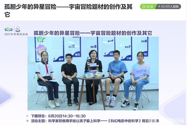 5月29日,中国科普作家协会2021科学阅读活动(第一季)第七期邀请科幻作家马传思和北京景山学校正高级语文教师周群,进行“孤胆少年的异星冒险——宇宙冒险题材的创作及其它”主题分享。本次活动由中国科普作家协会、中国科幻研究中心主办,《科学故事会》杂志协办,清华大学学生科幻协会、北京大学学生科幻协会、首都师范大学科幻协会、中南财经政法大学科幻爱好者协会、安徽科技出版社、安徽少年儿童出版社、大连出版社、清大紫育提供支持,在新华网、科学加、知乎、小鹅通、哔哩哔哩等多个平台同步直播,线上观看人次接近80万。