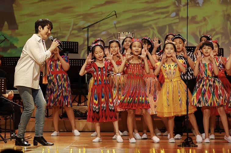 艺术家成方圆与身着美丽民族服装的孩子们合唱《孤独的牧羊人》