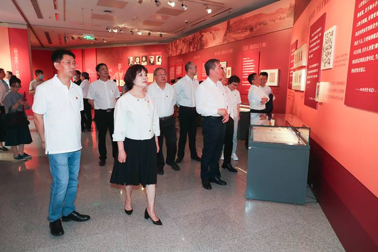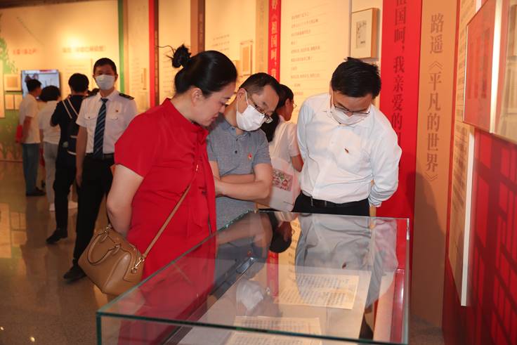 开幕式后,铁凝、钱小芊和参加开幕式的所有人员步入展厅参观展览。展览的第一部分是“1921年·时代的声音”,鲁迅的《故乡》、郭沫若的《女神》、郁达夫的《沉沦》等作品展现了五四那一代作家对时代与现实的敏锐把握。随后,“左联五烈士”的散文和诗作、方志敏的《可爱的中国》、茅盾的《子夜》、巴金的《家》、艾青的《我爱这土地》、老舍的《四世同堂》等作品的相关手稿、书籍依次映入眼帘,其中蕴含着青春的热血与激情,以及作家们对祖国和人民的深厚情感。《黄河大合唱》《小二黑结婚》《太阳照在桑干河上》等相关展品则勾连起解放区文学的昂扬基调。1949年新中国成立,文学的气象也随之翻新,展览通过胡风、臧克家、何其芳等人的诗作片段,以及关于第一次文代会的照片等展品展现新中国文学的新起点。关于上世纪五六十年代的文学,展览展出了《红岩》《红日》《红旗谱》《创业史》《青春之歌》《保卫延安》《乘风破浪》等长篇小说和魏巍的散文《谁是最可爱的人》、贺敬之的诗歌《雷锋之歌》等作品,一本本珍贵的初版书和一页页带着灵韵的作家手稿彰显着红色经典的魅力。展览以徐迟、周克芹、路遥和王蒙、蒋子龙、张洁、舒婷等作家的作品为例,展现了新时期文学与时代同频共振的特质。“新时代 新征程”板块则以视频的形式聚焦“百年路新征程诗歌创作工程”的成果,以及作家、诗人们对于新时代文学的展望。