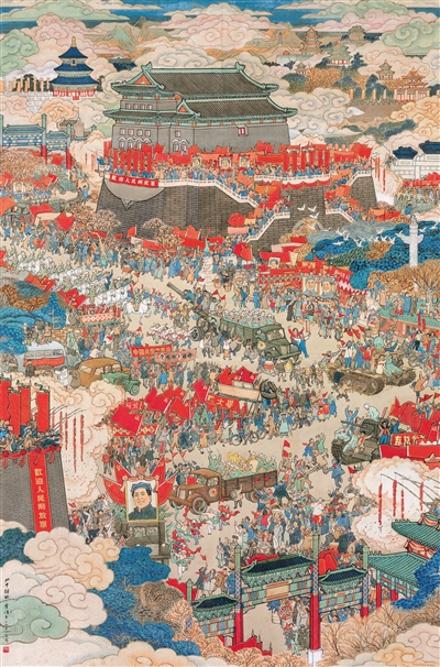 伴随着解放战争走向胜利的铿锵步伐,一座座城市宣告解放,人民解放军陆续举行了盛大的入城式,展现其高昂的士气,迎接新中国的诞生。与此同时,出现了一批以解放军入城式为主题的美术作品。新中国成立后,不少美术工作者持续从不同视角、以各种形式诠释这一主题,其中以对北平、南京、上海三座城市欢庆解放的描绘最具代表性。